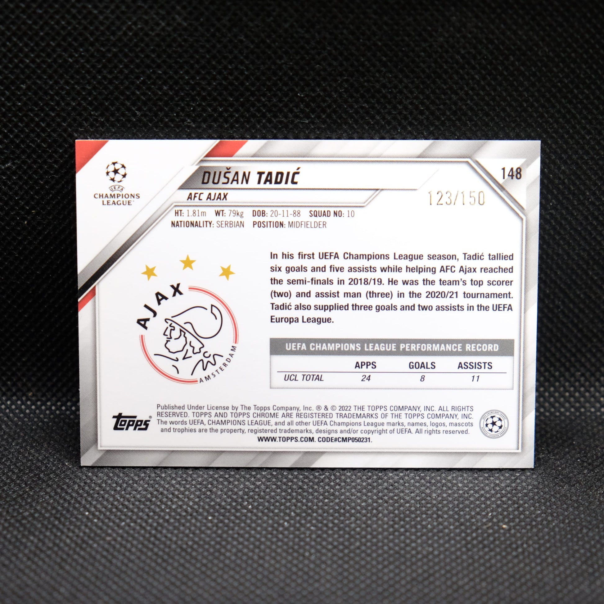 2021-22 Dusan Tadic Topps Chrome UEFA UCL #148 Blue Refractor /150