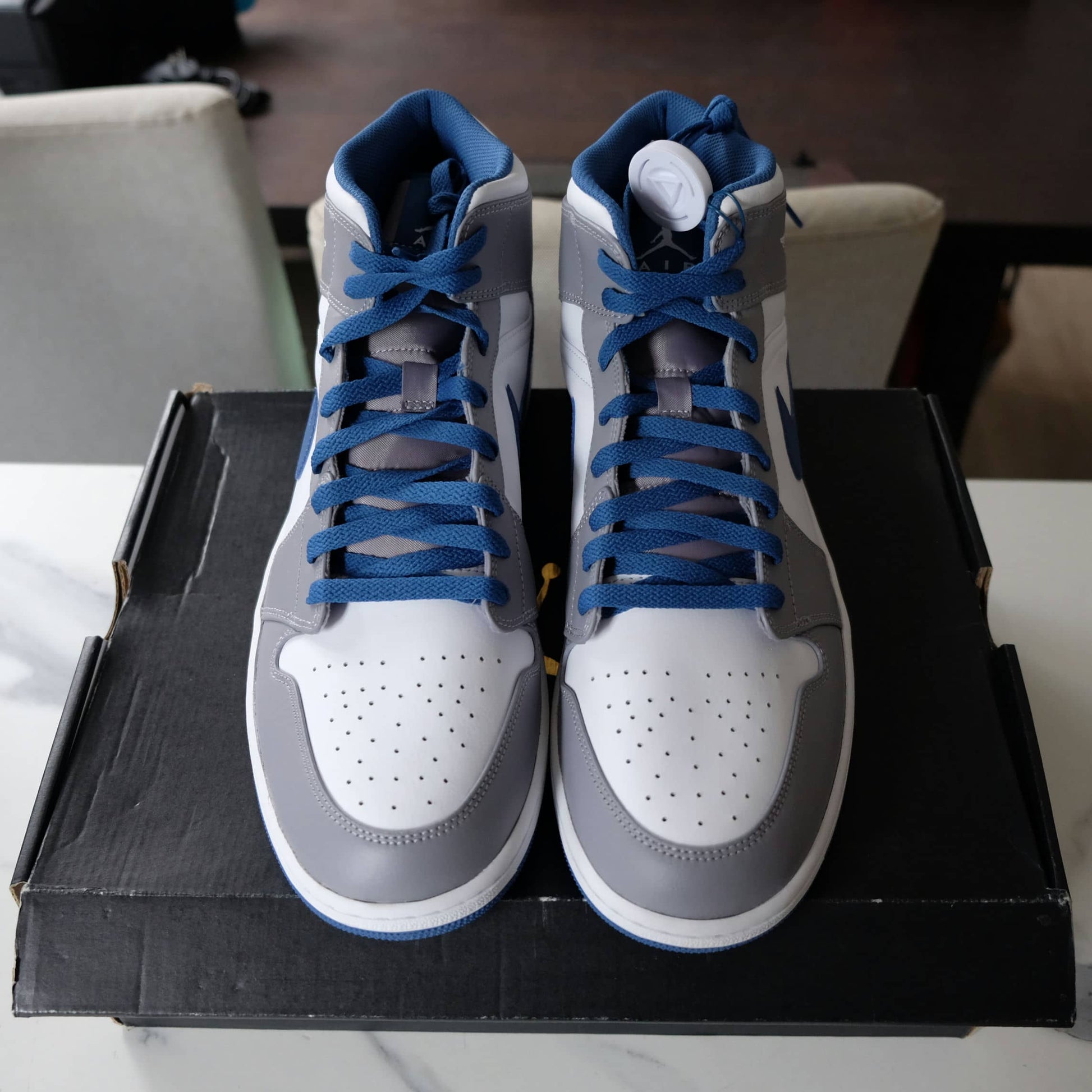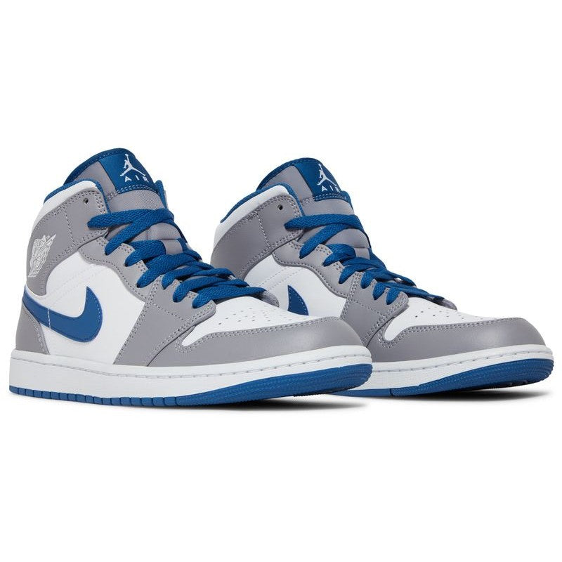 The Air Jordan 1 Mid True Blue features a mix of different colors, with cement grey, white, and true blue coming as the dominant hues.