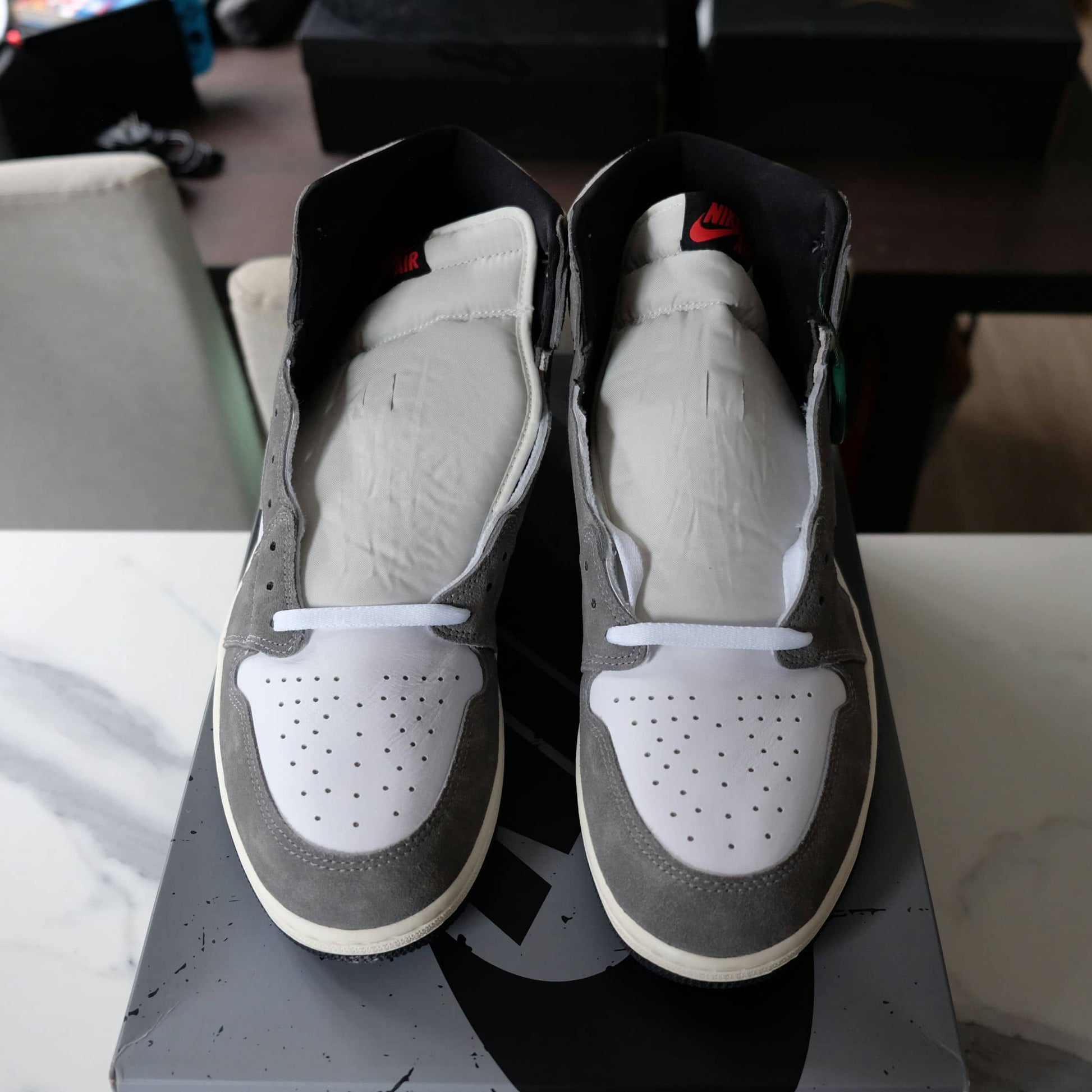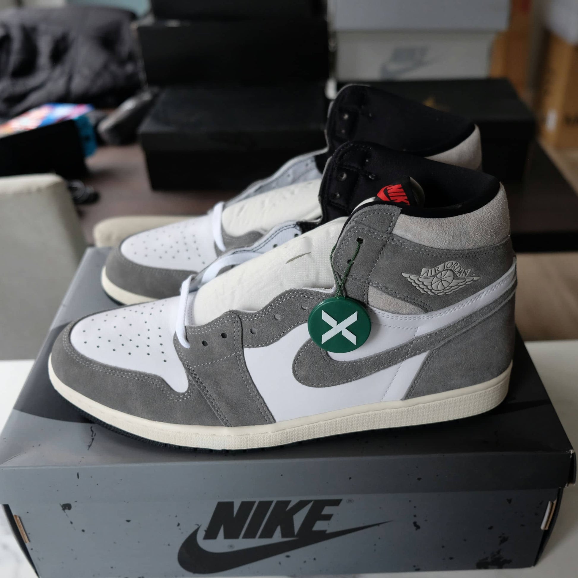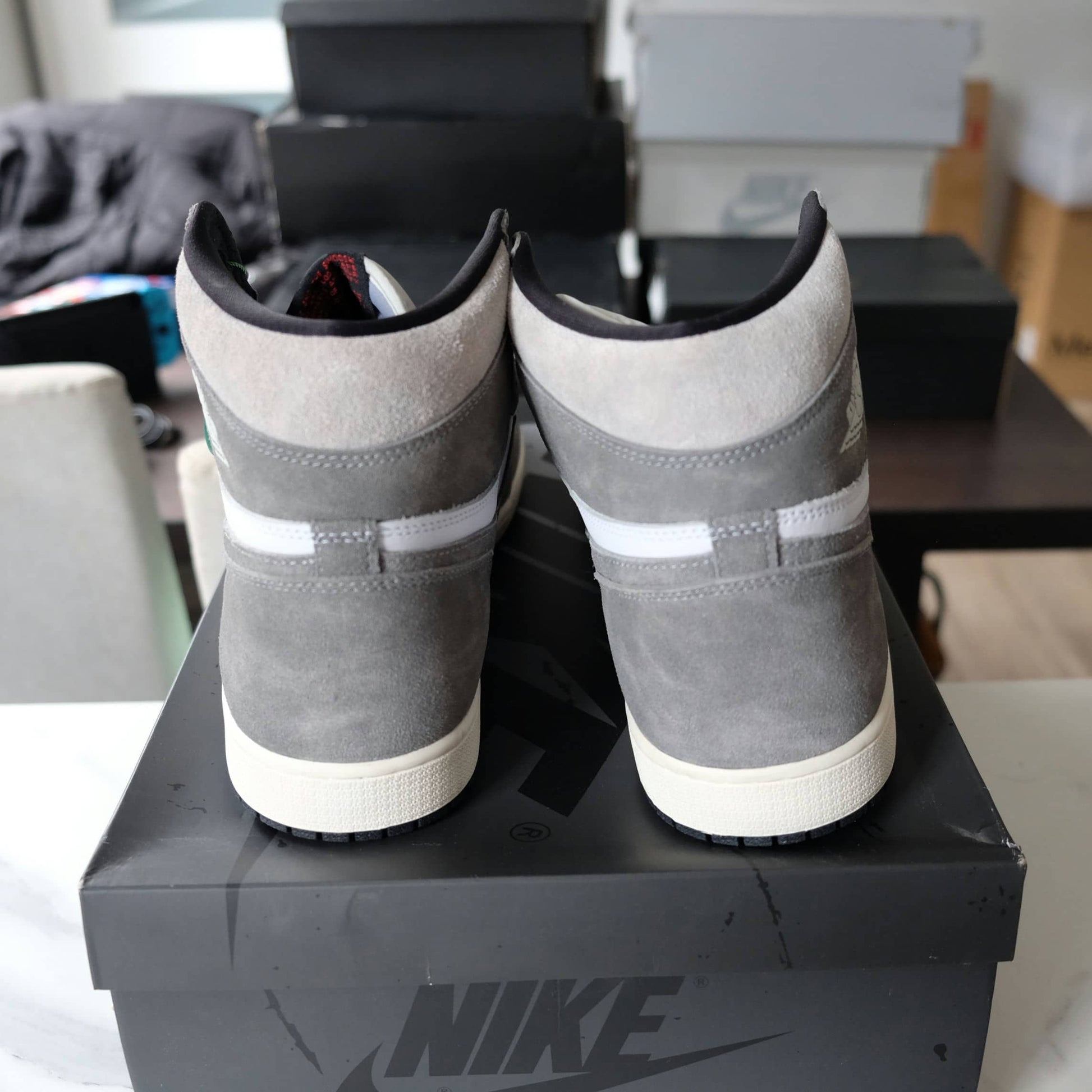 The Jordan 1 Retro High OG Washed Black is constructed using white leather and Washed Black uppers. Hints of grey are placed around the collar, while the sail colored midsole helps give the sneaker an aged design. The limited edition Air Jordan 1’s are tied together with white laces and feature a white Air Jordan Wings logo above the Swoosh.